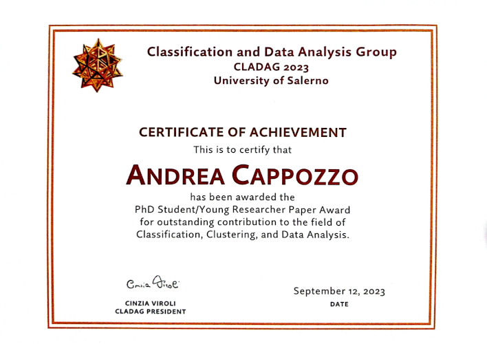 ANDREA CAPPOZZO has been awarded the Phd Student/Young Researcher Paper Award for outstanding contribution to the field of Classification, Clustering and Data Analysis