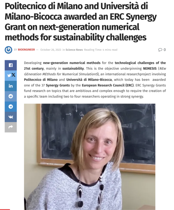 Il progetto NEMESIS -NEw generation MEthods for numerical SImulationS– è stato di recente finanziato nell’ambito dell’ERC Sinergy Grant 2023. Paola Antonietti, professoressa di Analisi Numerica presso il Dipartimento di Matematica del Politecnico di Milano, ne è Principal Investigator insieme a Lourenco Beirao da Veiga (Università degli Studi di Milano Bicocca, Italia), Daniele A. Di Pietro (Università di […]