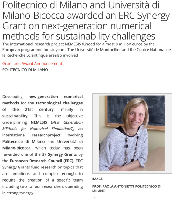 Alla guida del Laboratorio di Modellistica e Calcolo Scientifico MOX del Dipartimento di Matematica del Politecnico di Milano c’è la professoressa Paola Antonietti, principal investigator nel team che si è aggiudicato il Synergy Grant dell’ERC – Consiglio Europeo della Ricerca: un finanziamento pari a 7,8 milioni di euro per un periodo di sei anni. […]